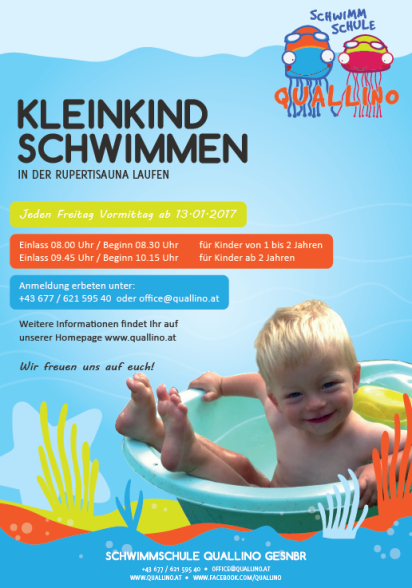 Ab sofort bieten wie jeden Freitag Vormittag offenes Kleinkindschwimmen in Laufen an. Die Rupertisauna bietet mit 32 Grad warmen, gesunden Salzwasser die perfekten Voraussetzungen.